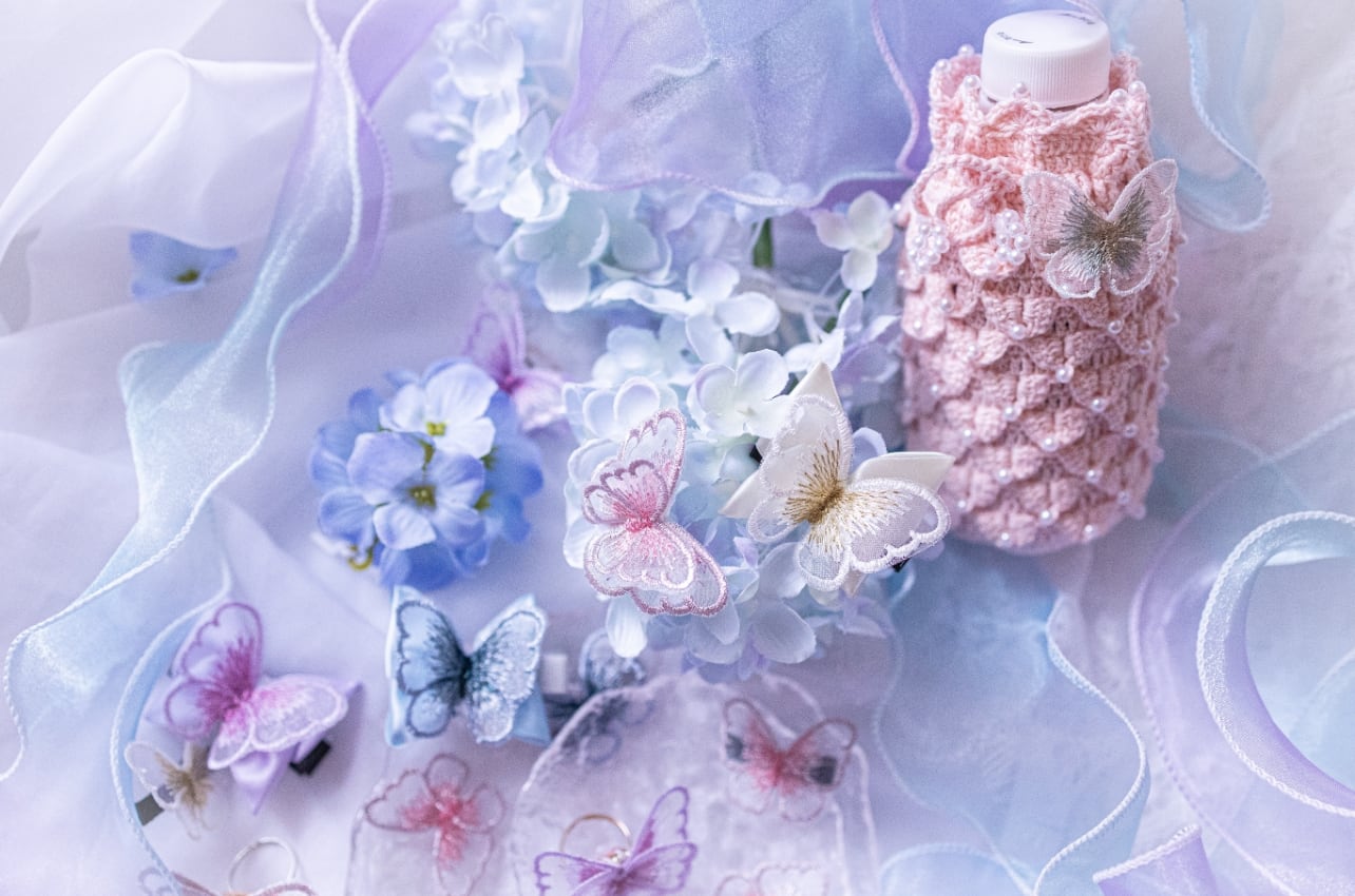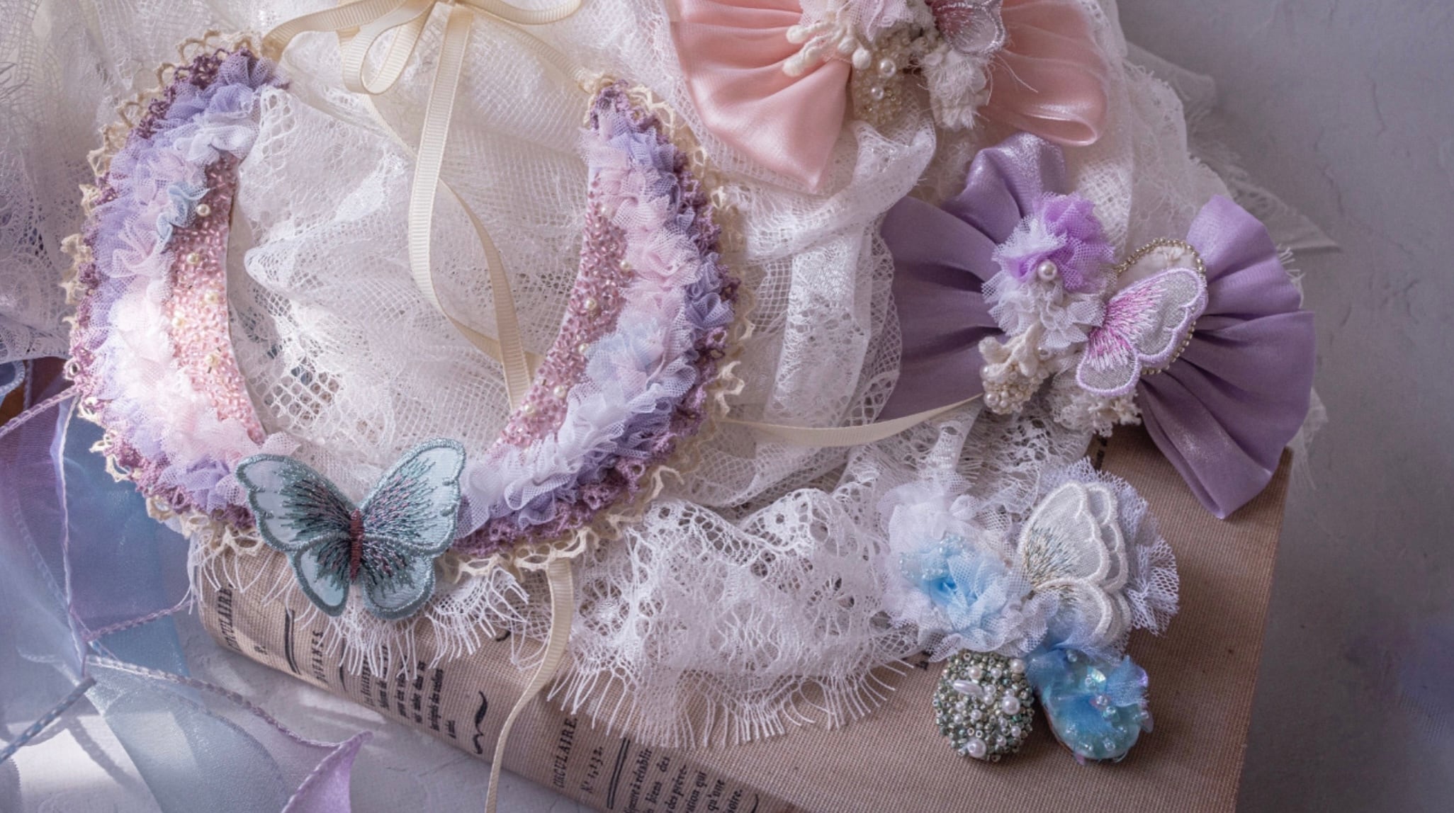 紫陽花の花びらのような やさしいピンクやラベンダーの色を重ね、 ビーズ刺繍と小さなお花、レースを組み合わせて ふんわりとした世界観に仕上げたちょうちょのブローチです。 雨上がりの庭で、 紫陽花のまわりをそっと舞う 小さなちょうちょをイメージしています。 パールやビーズをひと粒ずつ縫い留め、 ひと針ひと針丁寧に仕立てた 小さな手仕事のアクセサリー。 お洋服の胸元はもちろん、 ストールやバッグ、帽子などに添えるだけで やさしい彩りをプラスしてくれます。 日常の中でふと目に入るたび、 少し気持ちがやわらぐような そんな存在になれたら嬉しいです。 贈り物にも選ばれています。