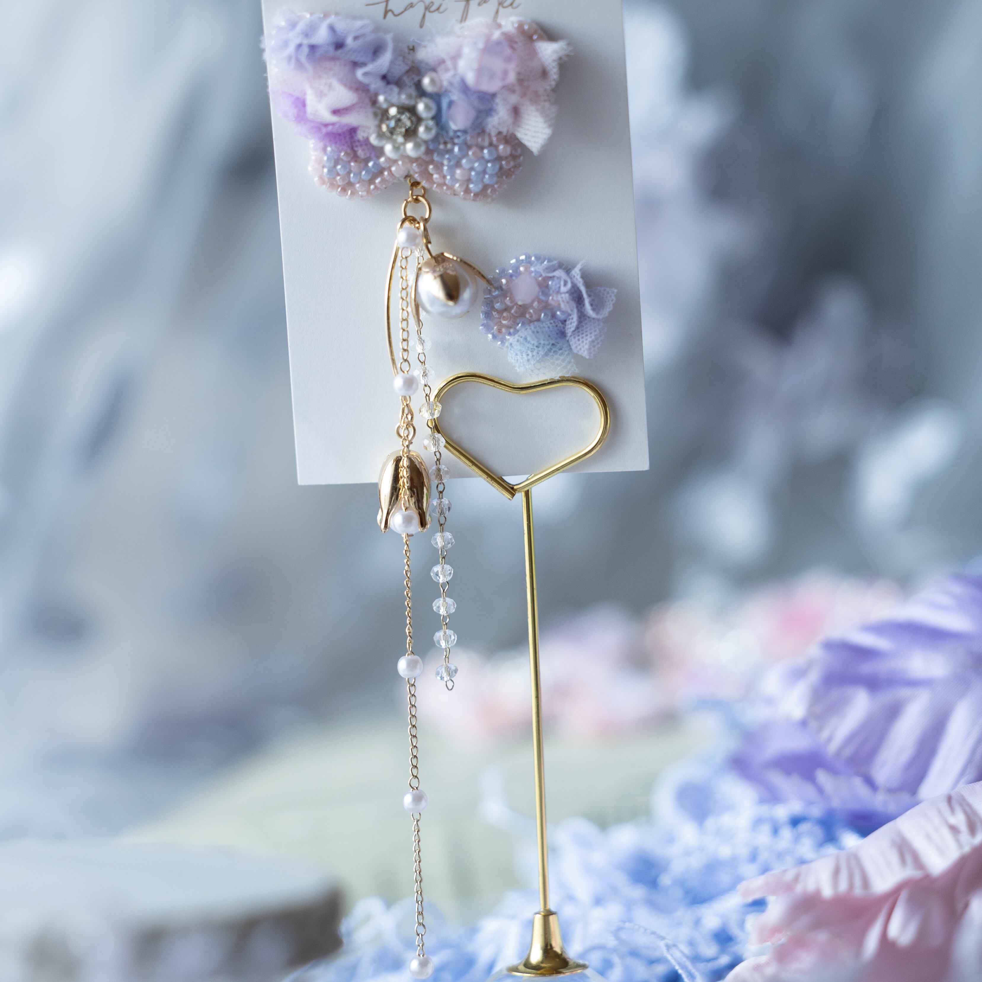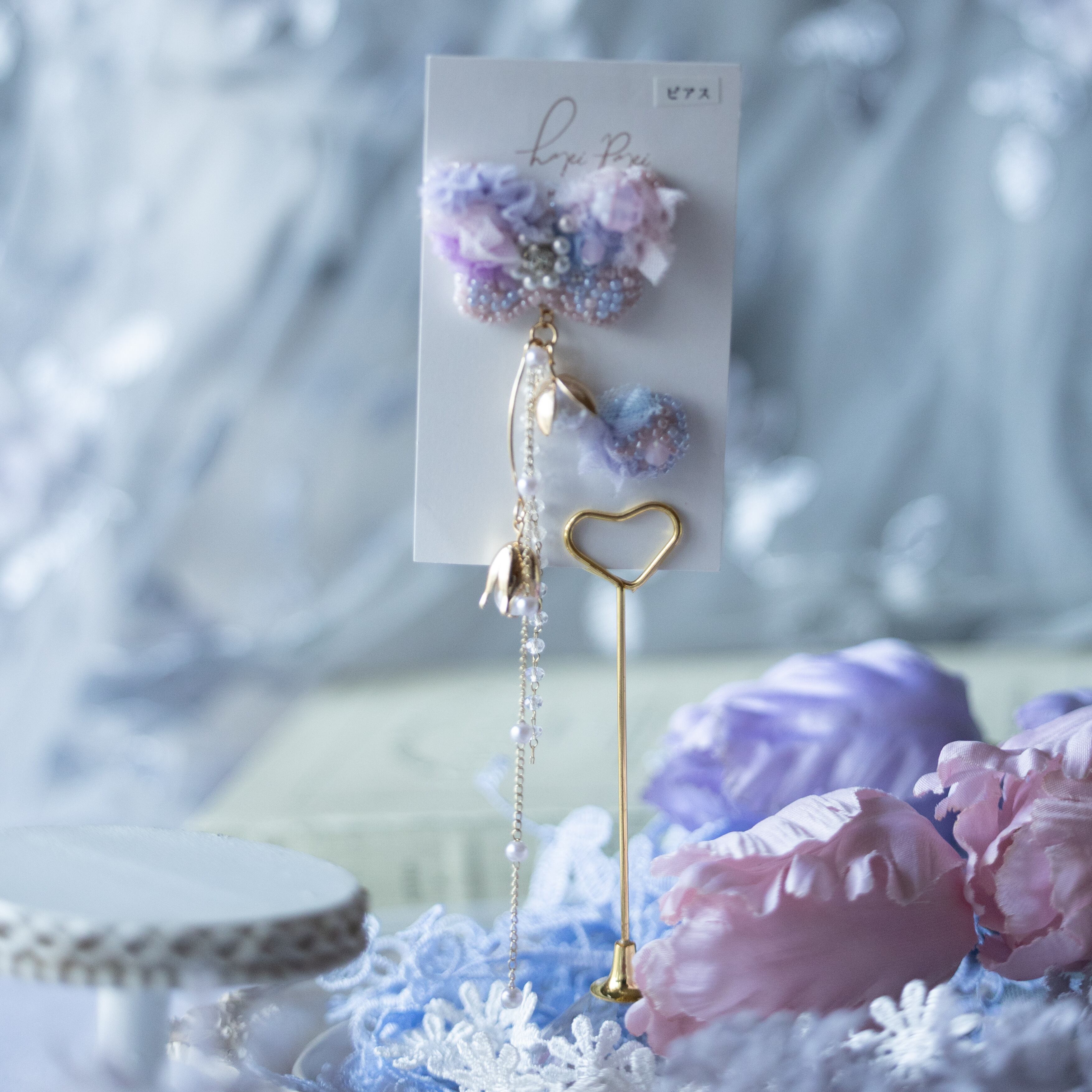 淡いブルーやピンク、ニュアンスカラーのビーズが、まるで夢の中にいるような雰囲気を醸し出し、繊細なレースを重ねることで、柔らかい印象を与えています。